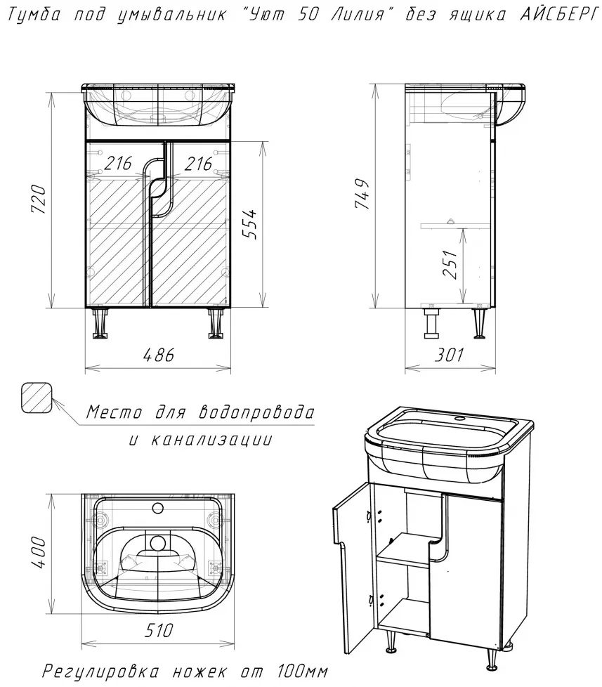 Характеристики товара Тумба под умывальник напольная Айсберг Уют 50 белый DA2001T
