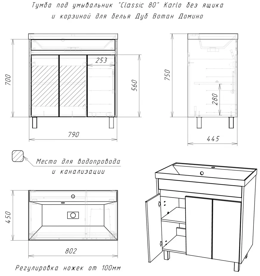 Характеристики товара Тумба под умывальник напольная Домино Karlo 80 белый/дуб вотан DK5304T