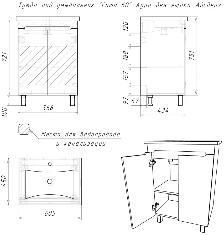 Характеристики товара Тумба под умывальник напольный Айсберг Como 60 белый DA2502T