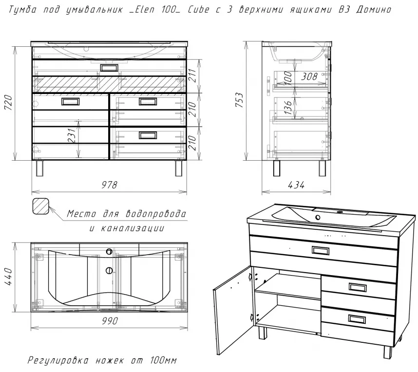 Характеристики товара Тумба под умывальник напольный Домино Elen 100 белый DC5001T