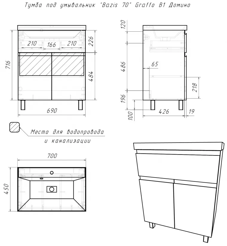 Характеристики товара Тумба под умывальник напольный Домино Graffo 70 графит DGr2413T