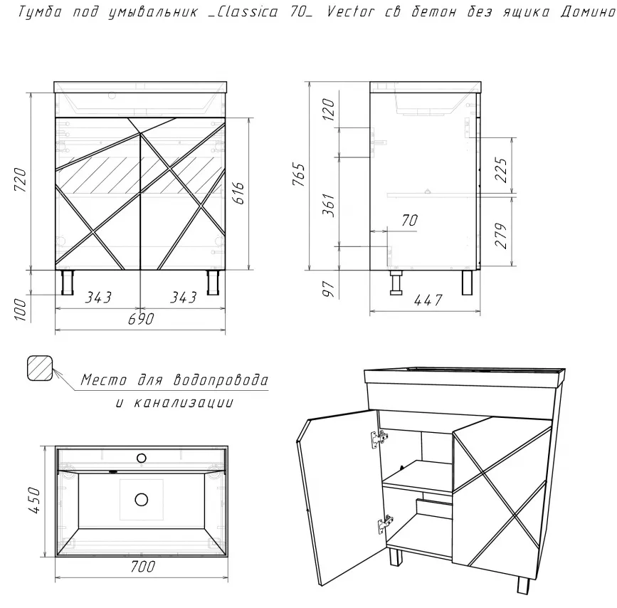 Характеристики товара Тумба под умывальник напольный Домино Vector 70 метрополитан грей/бетон серый DV6613T