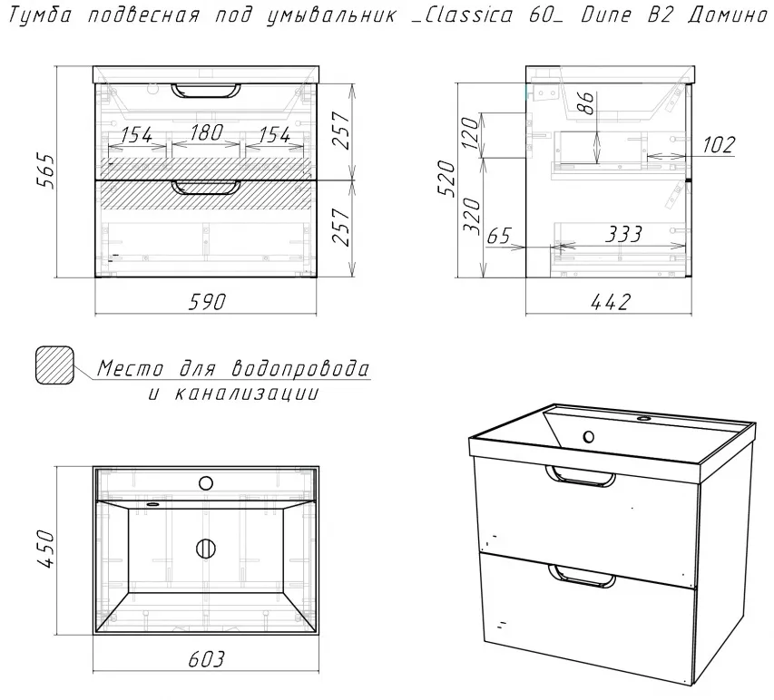 Характеристики товара Тумба под умывальник подвесная Домино Classica 60 серый тауп DD2501T