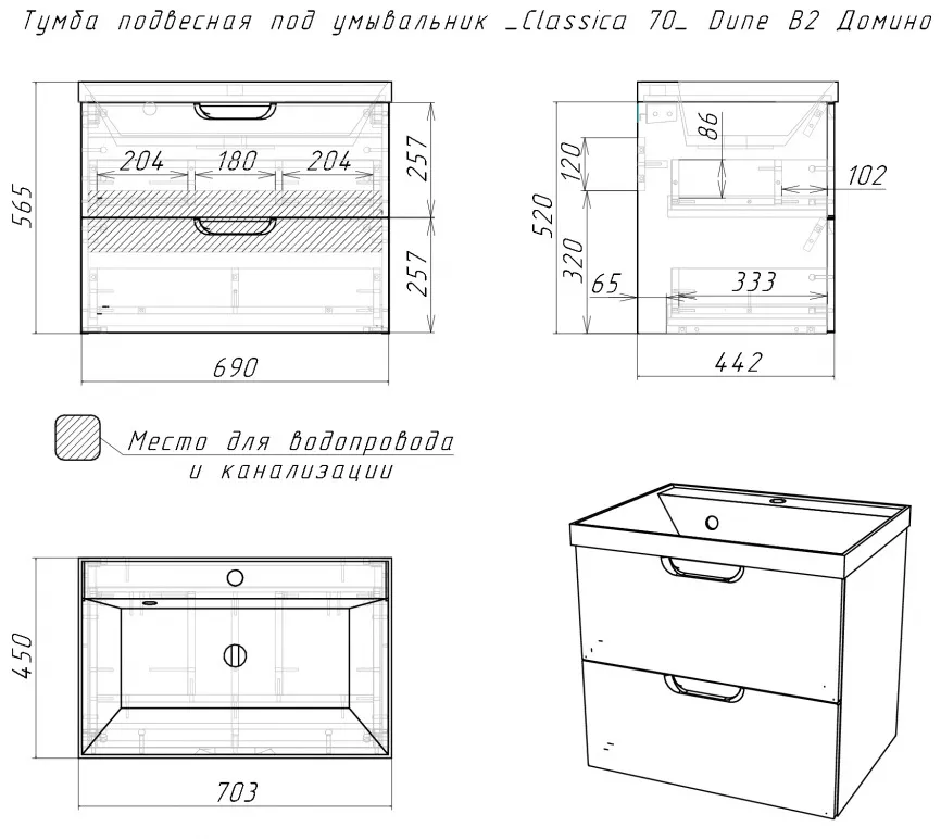 Характеристики товара Тумба под умывальник подвесная Домино Classica 70 олива DD2505T