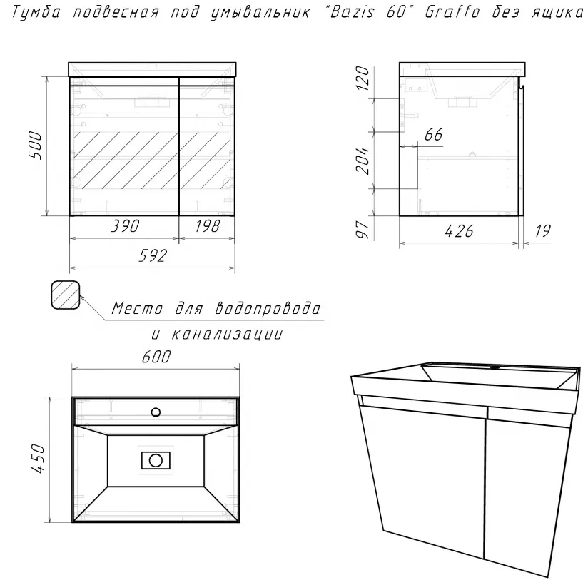 Характеристики товара Тумба под умывальник подвесная Домино Graffo 60 графит DGr2406T