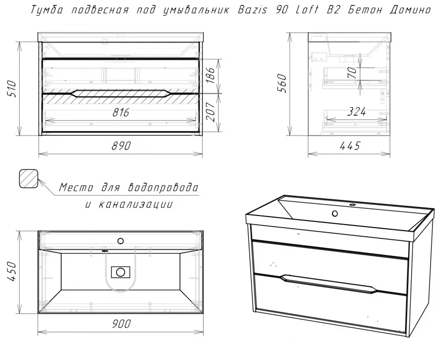 Характеристики товара Тумба под умывальник подвесная Домино Loft 90 бетон DL5604T