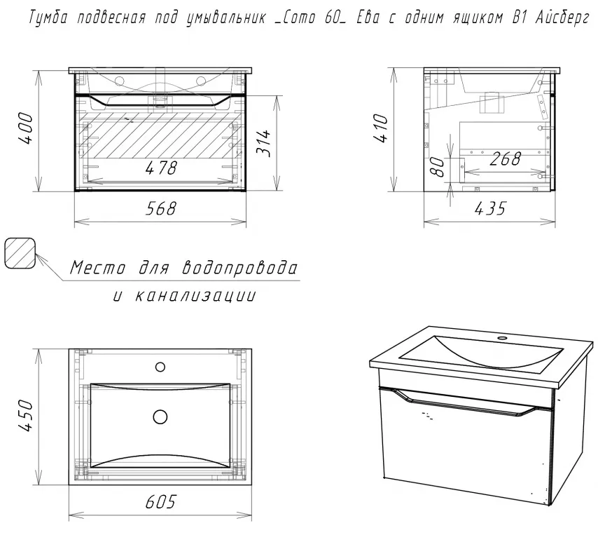 Характеристики товара Тумба под умывальник подвесной Айсберг Como 60 белый DA5910T