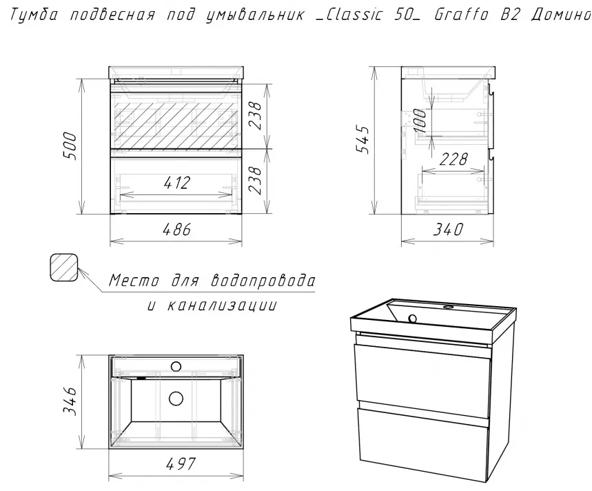 Характеристики товара Тумба под умывальник подвесной Домино Graffo 50 графит DGr2110T