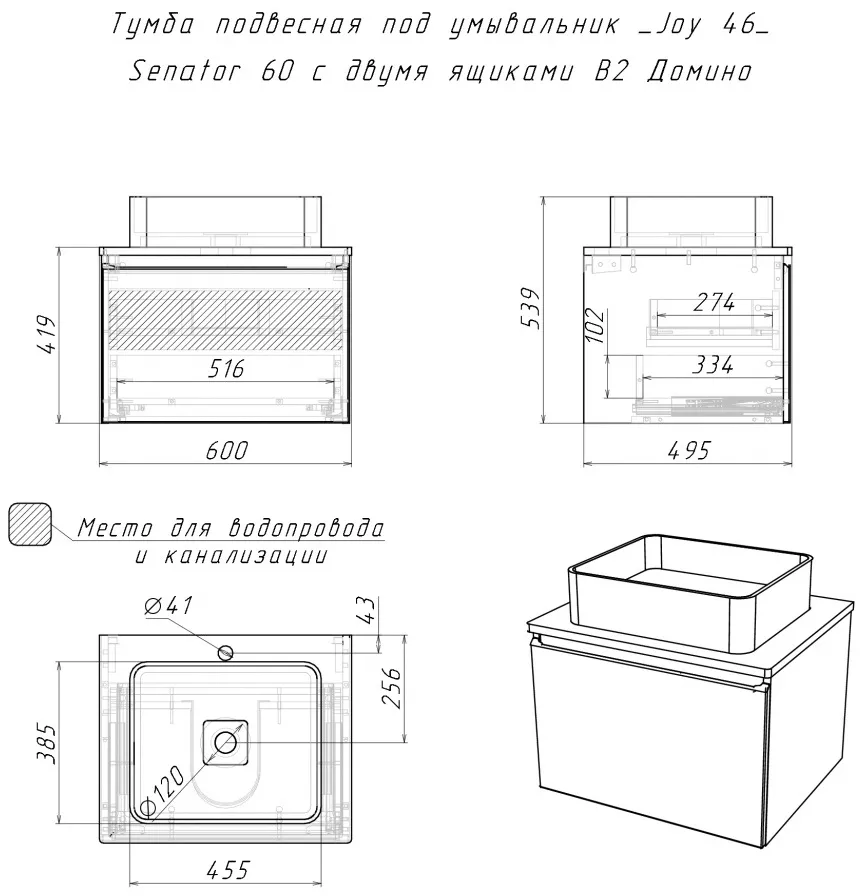 Характеристики товара Тумба под умывальник подвесной Домино Senator 60 белый/графит DS4304T