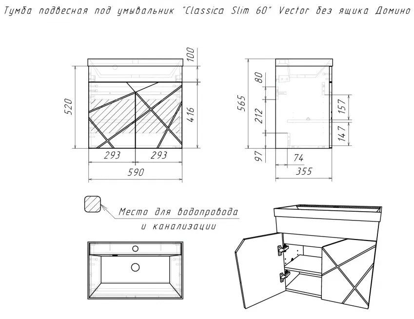 Характеристики товара Тумба под умывальник подвесной Домино Vector 60 метрополитан грей/бетон серый DV6610T