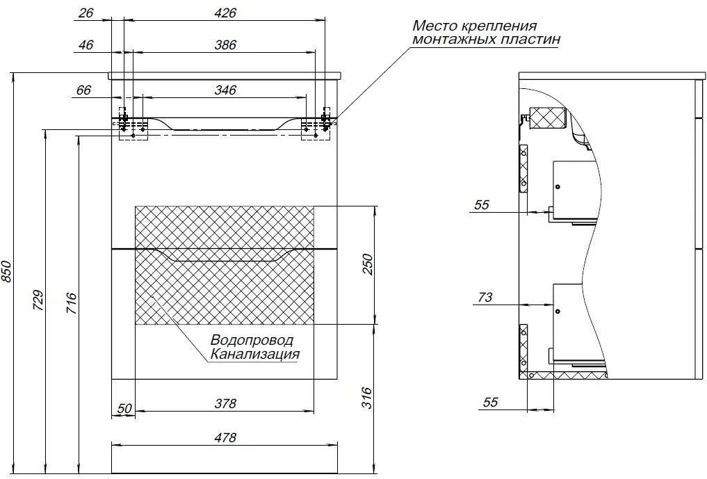 Характеристики товара Тумба-умывальник Aquanet Практика 50 маренго 00330456+44050