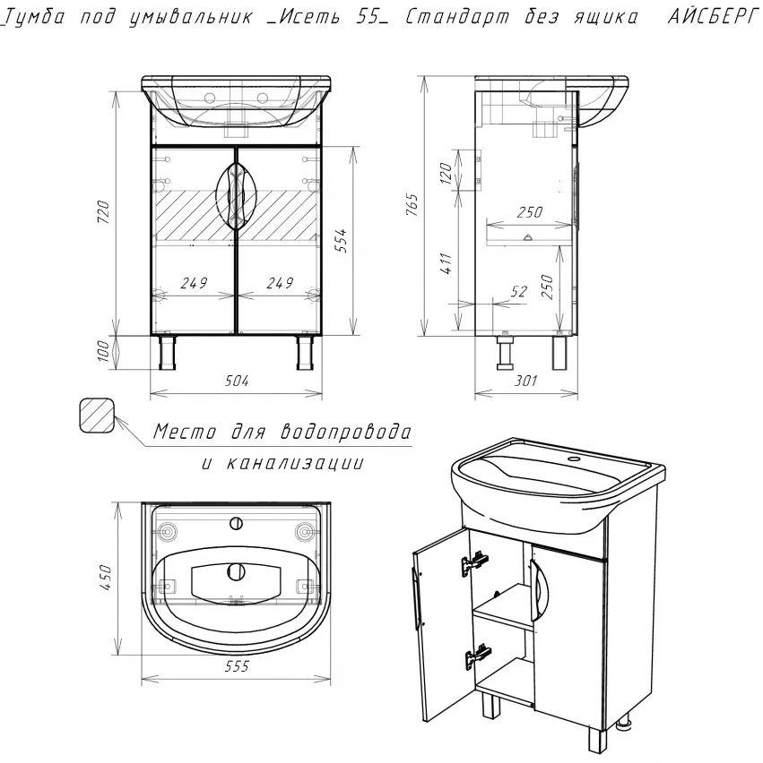 Характеристики товара Тумба-умывальник напольная Айсберг Стандарт 55 белый DA2402T+4607152360509