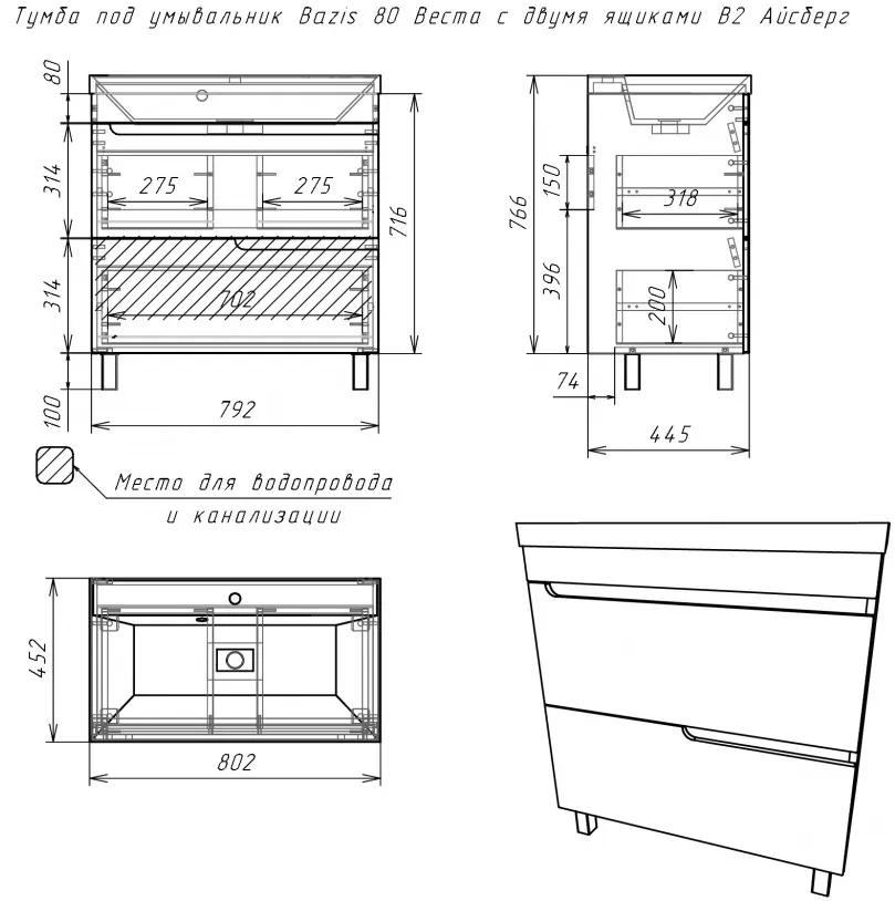 Характеристики товара Тумба-умывальник напольная Айсберг Веста 80 белый DV5908T+4670142930020
