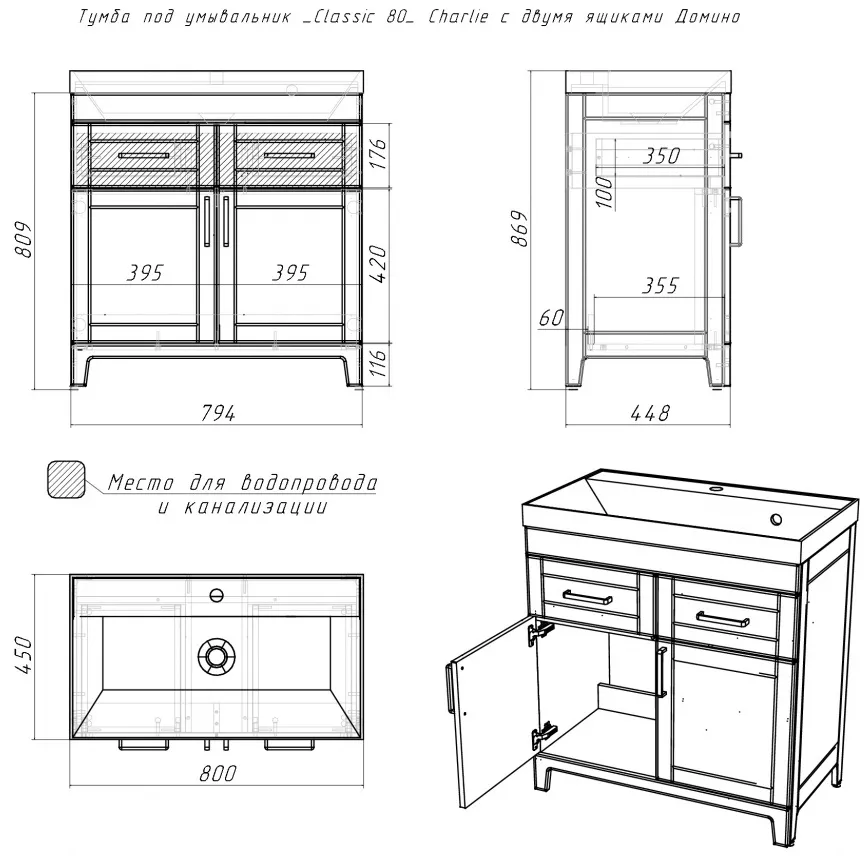 Характеристики товара Тумба-умывальник напольная Домино Charlie 80 белый DCh2501T+4627173210188