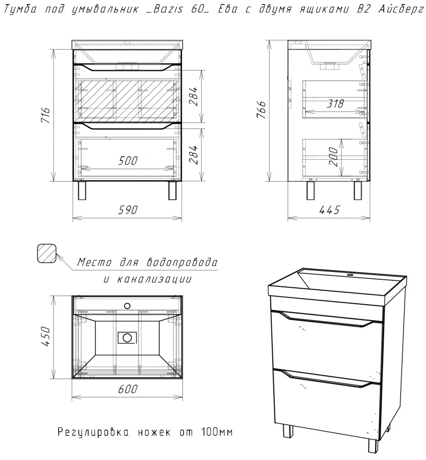 Характеристики товара Тумба-умывальник напольный Айсберг Ева 60 белый/бетон DA5915T+4670142930044