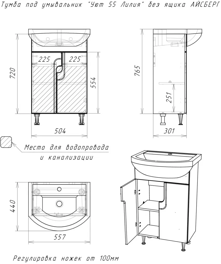Характеристики товара Тумба-умывальник напольный Айсберг Лилия 55 белый DA2002T+Вн МуБ03