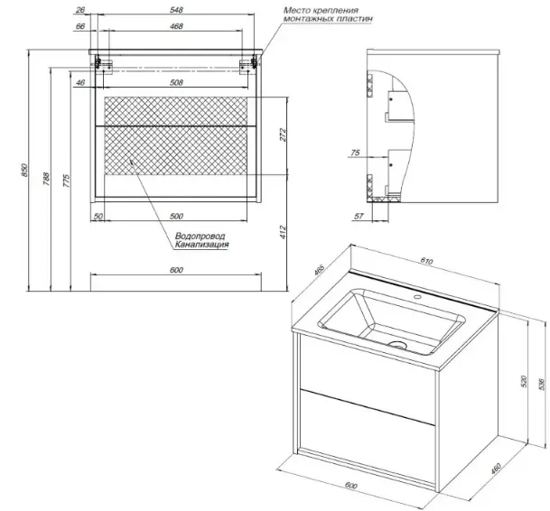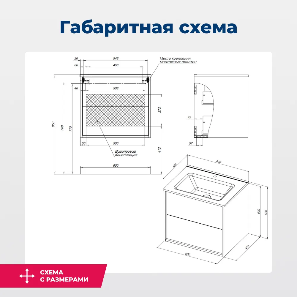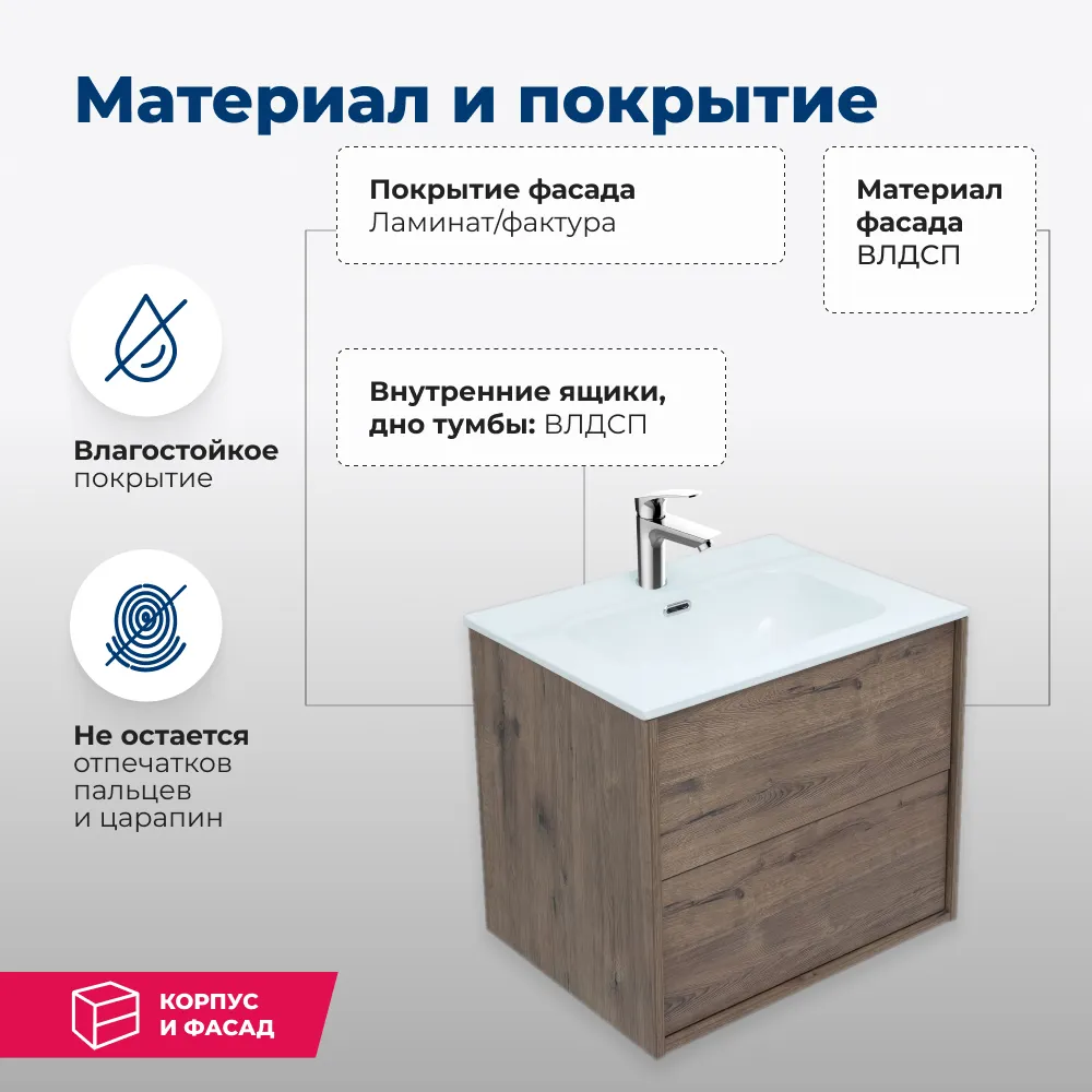 Характеристики товара Тумба-умывальник подвесная Aquanet Lino 60 (Flat) дуб веллингтон 00287541+00254363