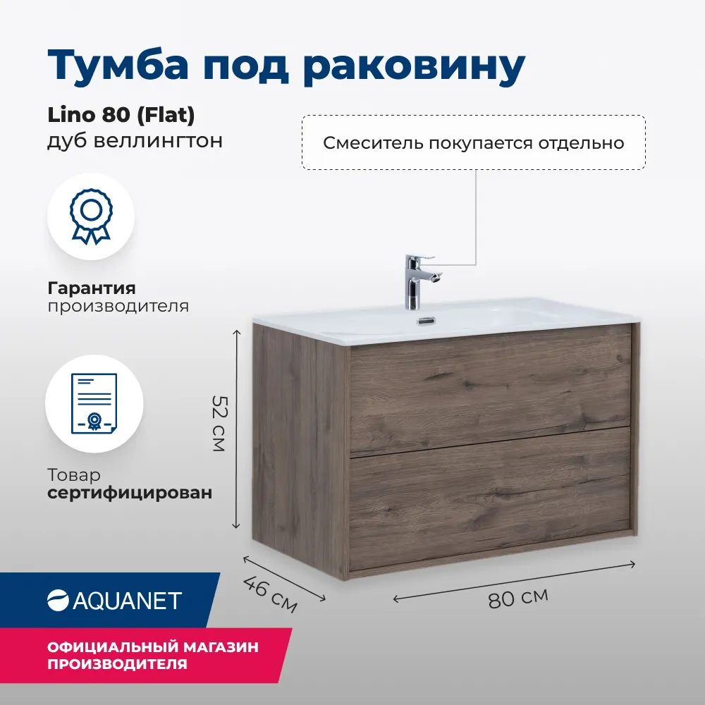 Характеристики товара Тумба-умывальник подвесная Aquanet Lino 80 (Flat) дуб веллингтон 00287543+00254364
