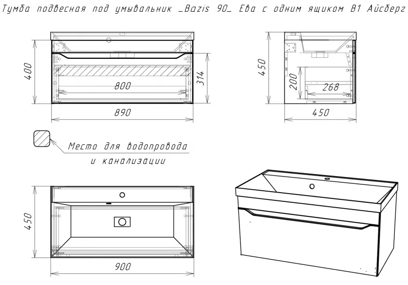 Характеристики товара Тумба-умывальник подвесная Айсберг Ева 90 белый DA5904T+4670142930013