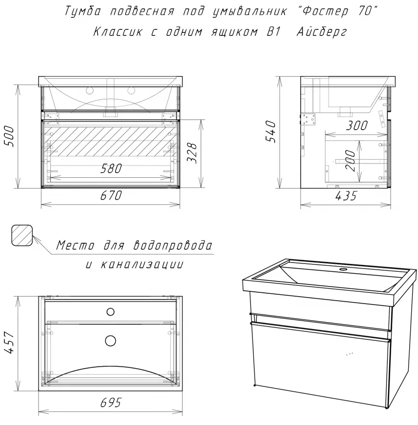 Характеристики товара Тумба-умывальник подвесная Айсберг Классик 70 белый DA3010T+4620008197746