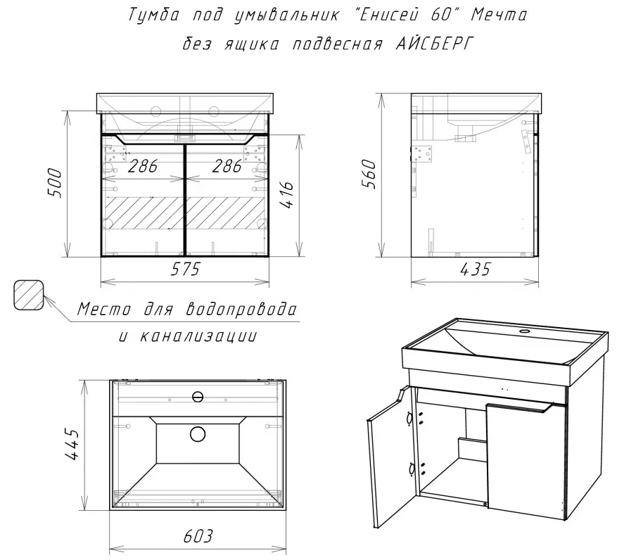 Характеристики товара Тумба-умывальник подвесная Айсберг Мечта 60 белый/бетон DM2335T+4607152361674