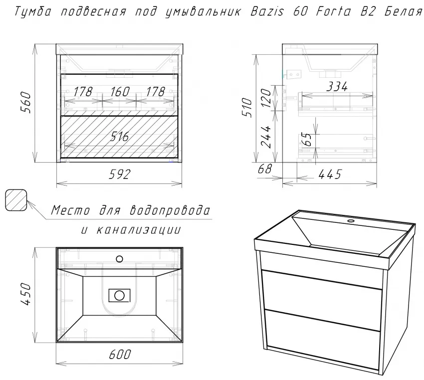 Характеристики товара Тумба-умывальник подвесная Домино Forta 60 белый глянец DF2500T+4670142930044