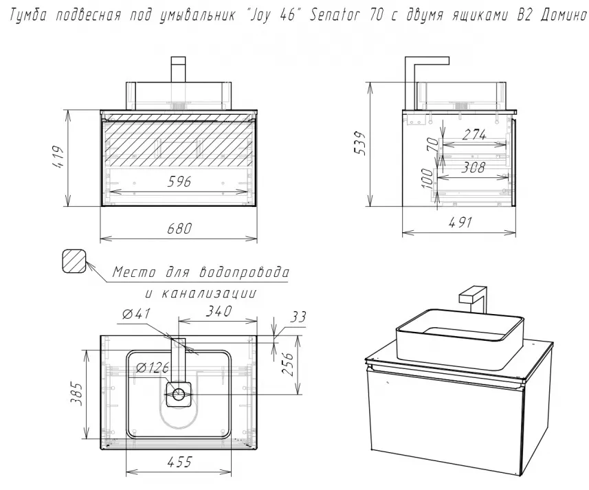 Характеристики товара Тумба-умывальник подвесная Домино Senator 70 белый/дуб вотан DS4301T+641945