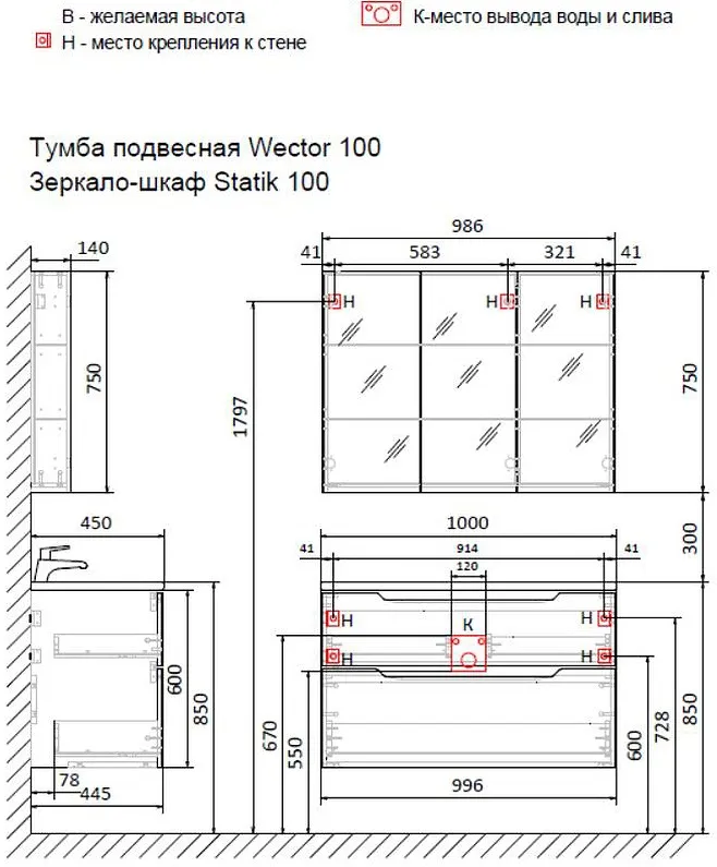 Характеристики товара Тумба-умывальник подвесная Raval Wector 100 белый Wct.01.100/P/W/MD+4627173210201