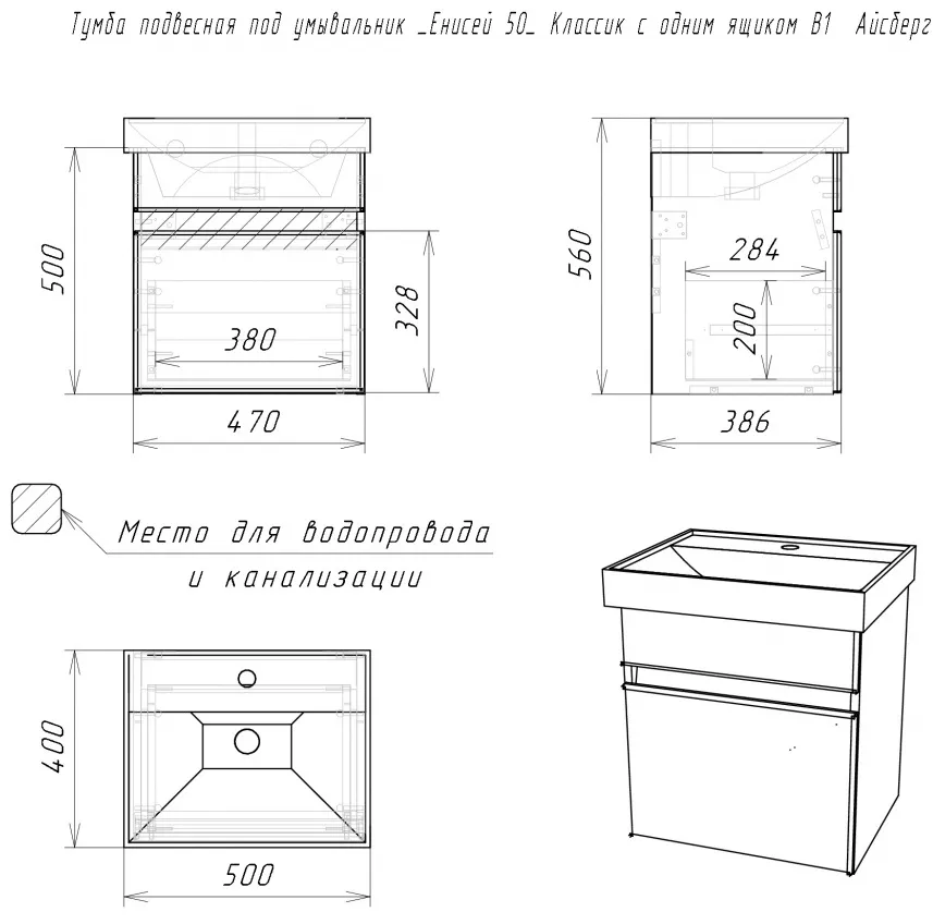 Характеристики товара Тумба-умывальник подвесной Айсберг Классик 50 белый DA3008T+4607152361544