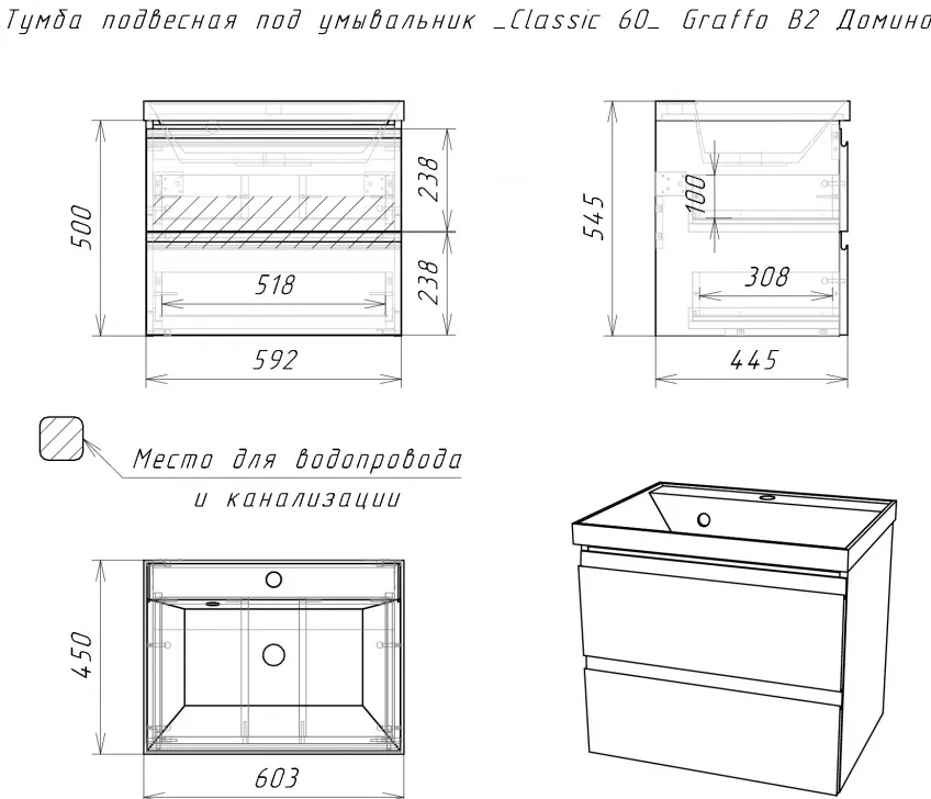 Характеристики товара Тумба-умывальник подвесной Домино Graffo 60 белый DGr2114T+4627173210164