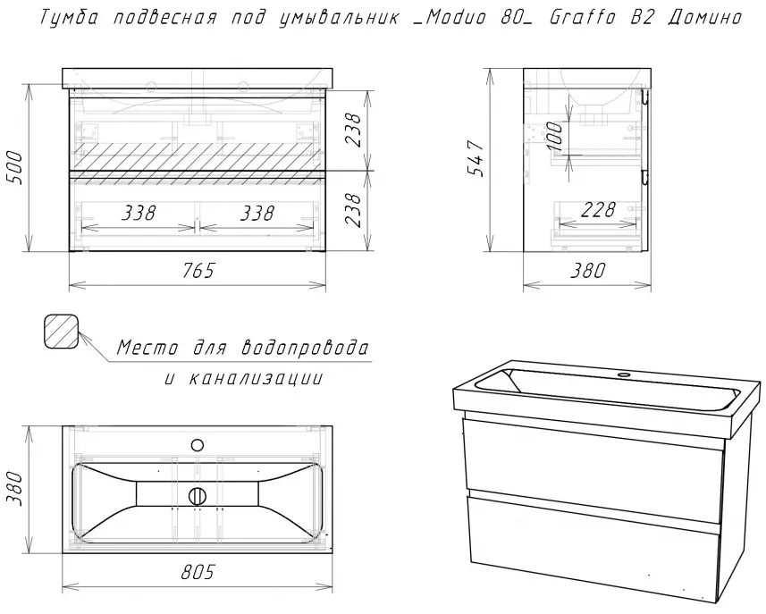 Характеристики товара Тумба-умывальник подвесной Домино Graffo 80 белый DGr2103T+S-UM-MOD80SL/1