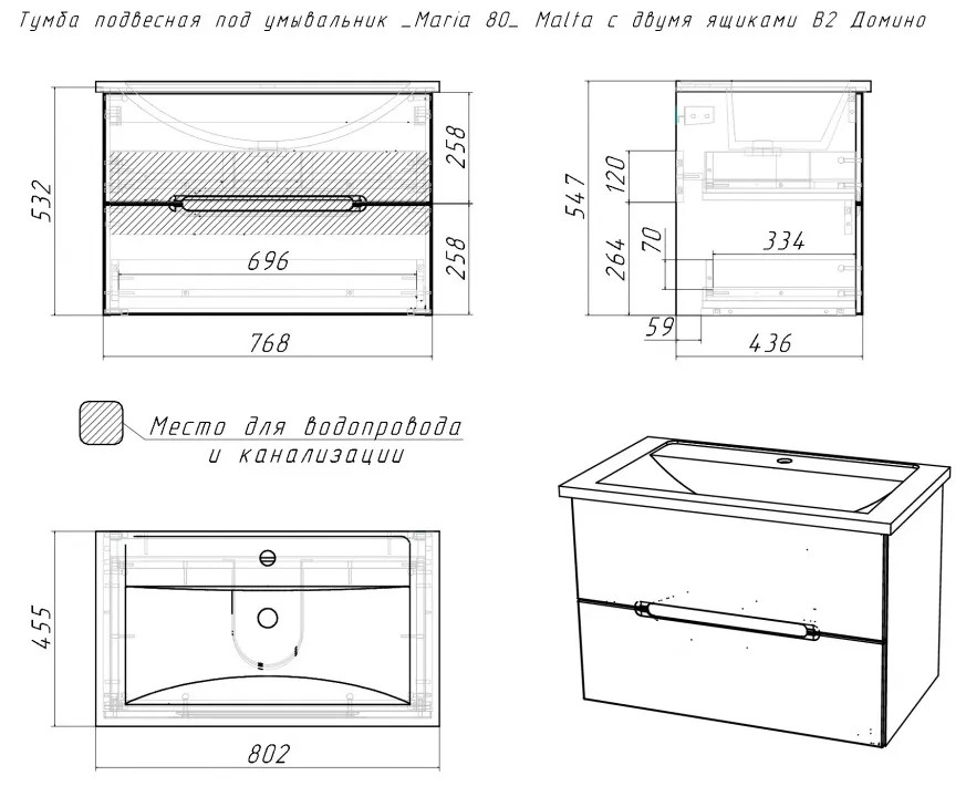 Характеристики товара Тумба-умывальник подвесной Домино Malta 80 белый DM4501T+1WH302251