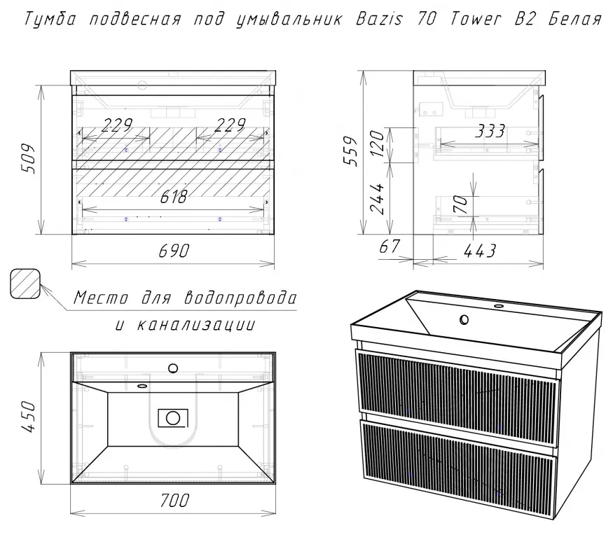 Характеристики товара Тумба-умывальник подвесной Домино Tower 70 графит DT2501T+4670142930037