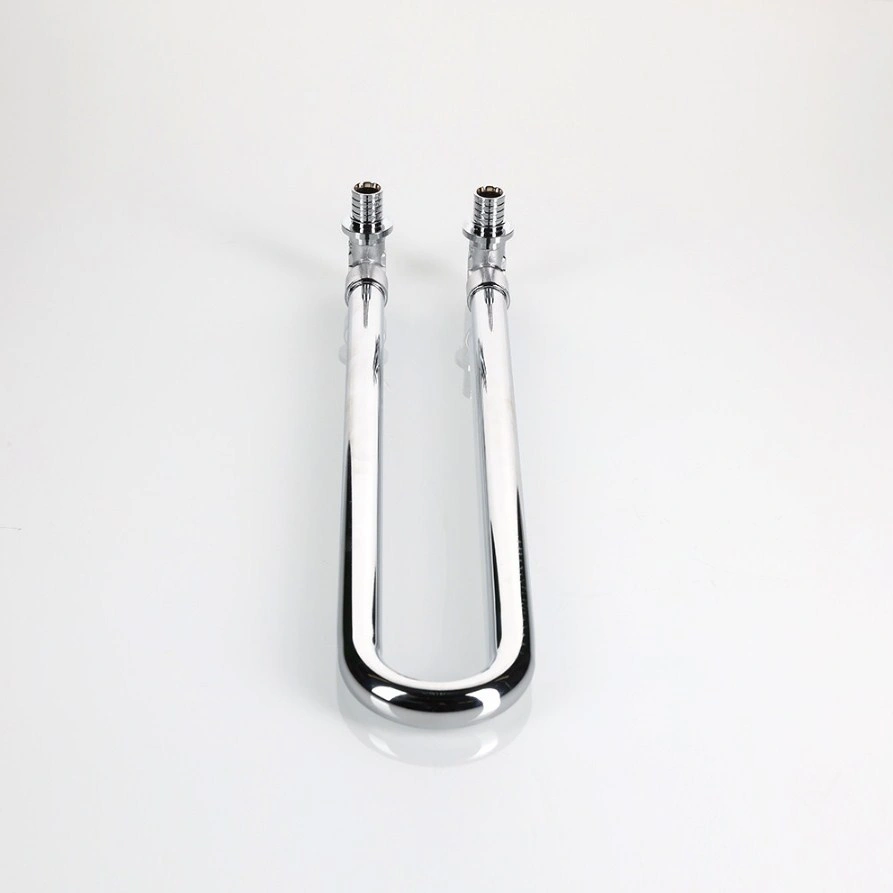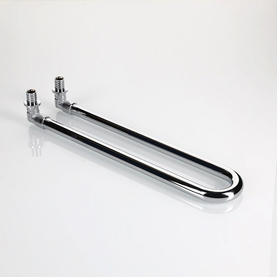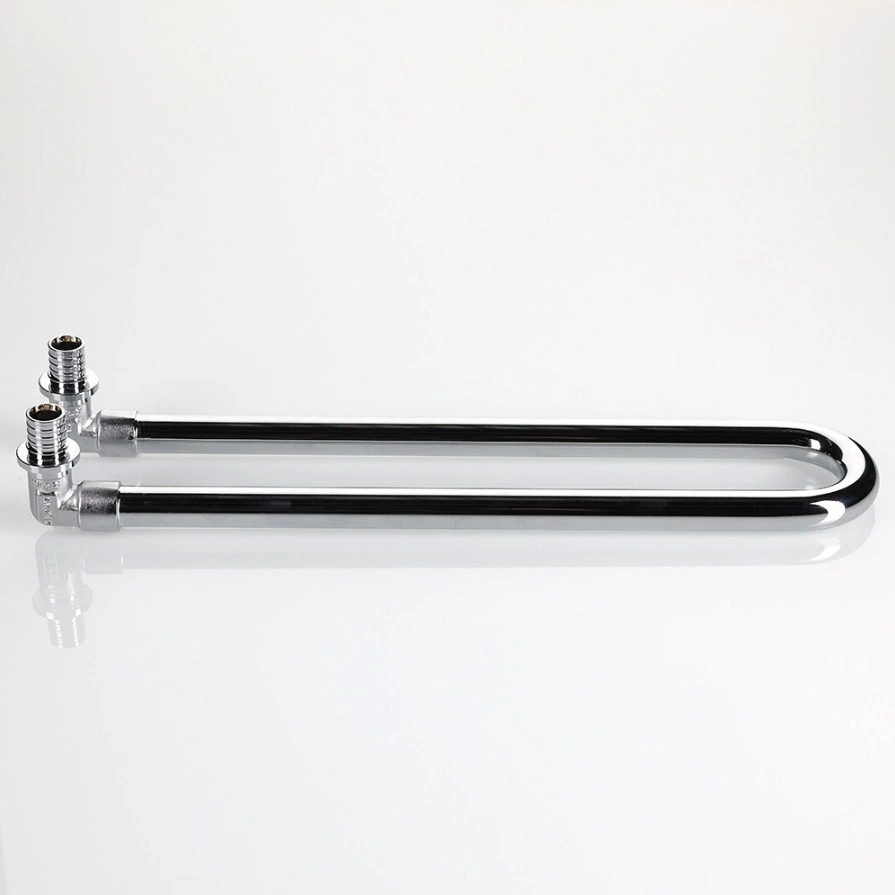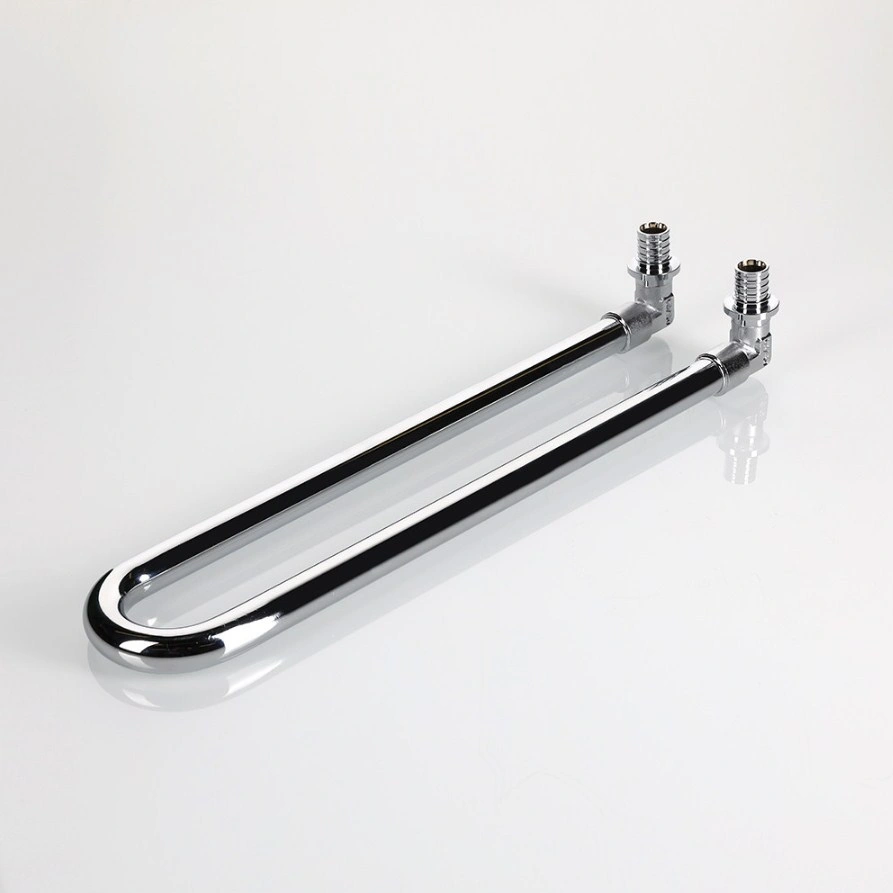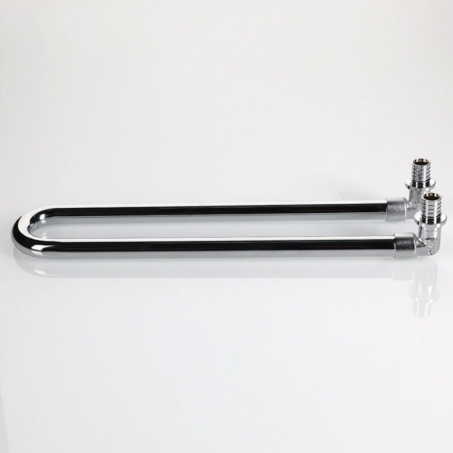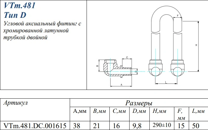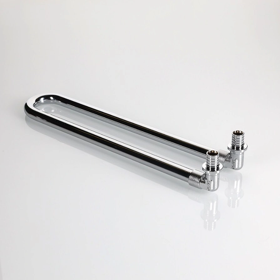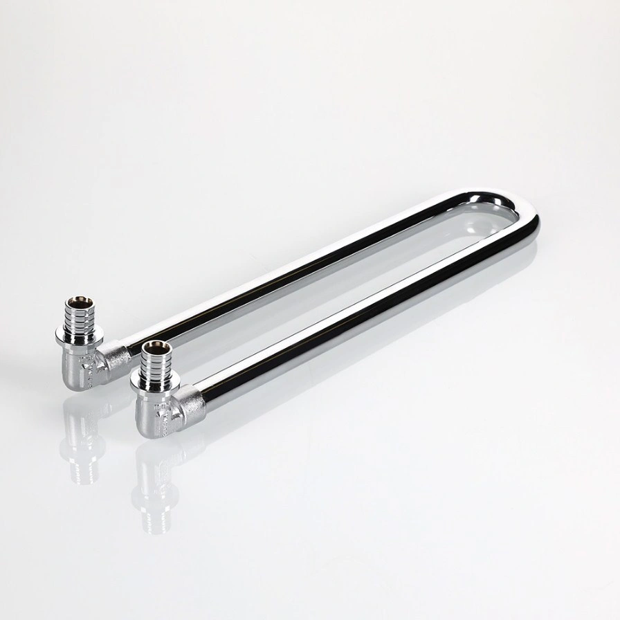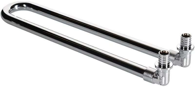 Сдвоенный аксиальный угловой фитинг с латунной хромированной трубкой VTm.481.DС может применяться в случае, когда гидравлическое испытание (опрессовка) отопительной разводки производится до монтажа отопительных приборов. При этом соединитель используется как временный замыкающий участок. После проведения гидравлических испытаний калач трубки обрезается на требуемую длину роликовым труборезом. Длина трубки фитинга до сгиба – 30 см.