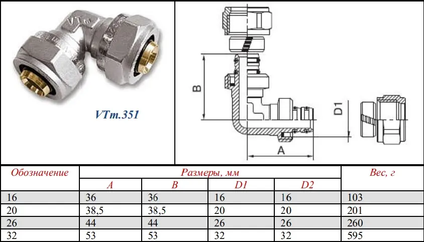 Характеристики товара Уголок компрессионный соединительный 32мм Valtec VTm.351.N.003232