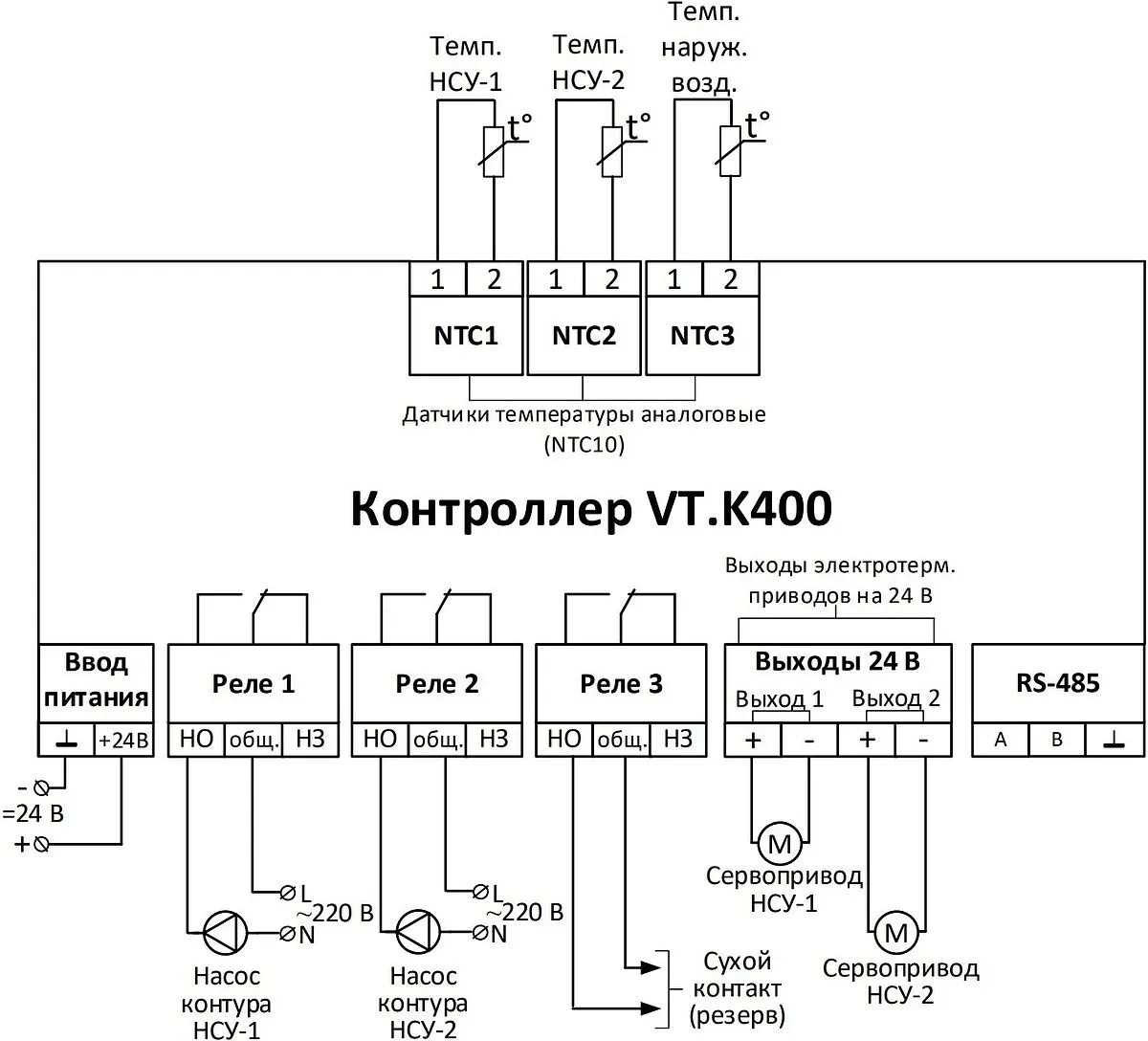 (VT.K400.0) Универсальный контроллер предназначен для плавного управления насосно-смесительными узлами различного типа. Управление приводом производится в плавном режиме с использование принципа ПИД-регулирования. Управление насосом производится в дискретном режиме (включить/выключить) по заданным параметрам работы отопительного контура.