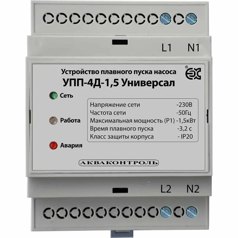 Устройства плавного пуска серии "Акваконтроль УПП" на DIN рейку, предназначены для плавного включения и выключения бытовых скважинных и поверхностных насосов центробежного типа без встроенных электронных систем управления и плавного пуска.