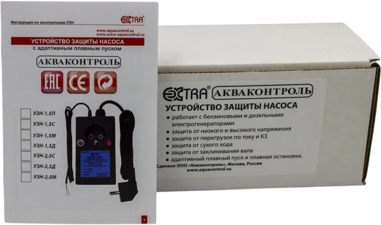 Устройство защиты насоса “Extra Акваконтроль” УЗН (далее — УЗН) предназначено для защиты скважинных, поверхностных и дренажных насосов центробежного типа с асинхронными электродвигателями, котрые не имеют встроенных электронных систем управления, частотного преобразователя или плавного пуска.