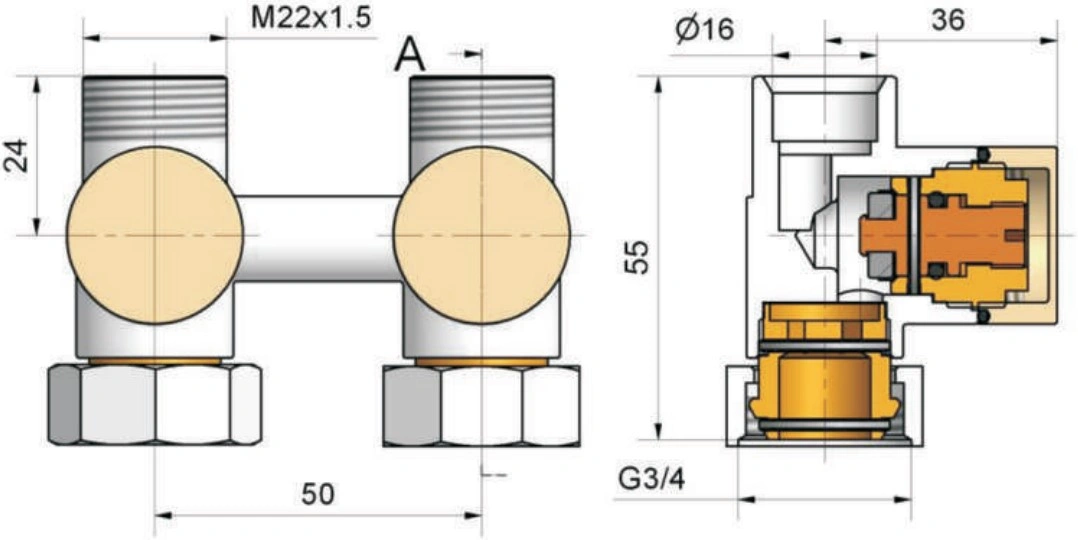 Характеристики товара Узел нижнего подключения радиатора прямой М22x1.5 x ¾"ек Schlosser Exclusive инд.заказ по RAL 601000018.Ral