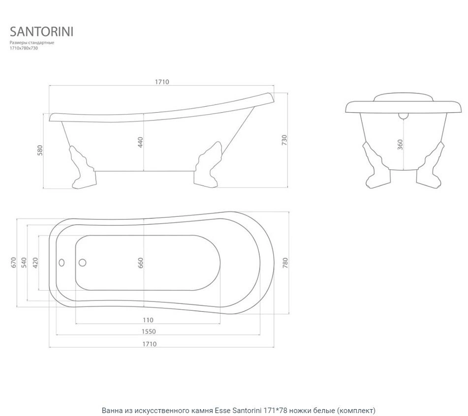 Характеристики товара Ванна отдельностоящая из искусственного камня Esse Santorini 171x78 ножки бронза