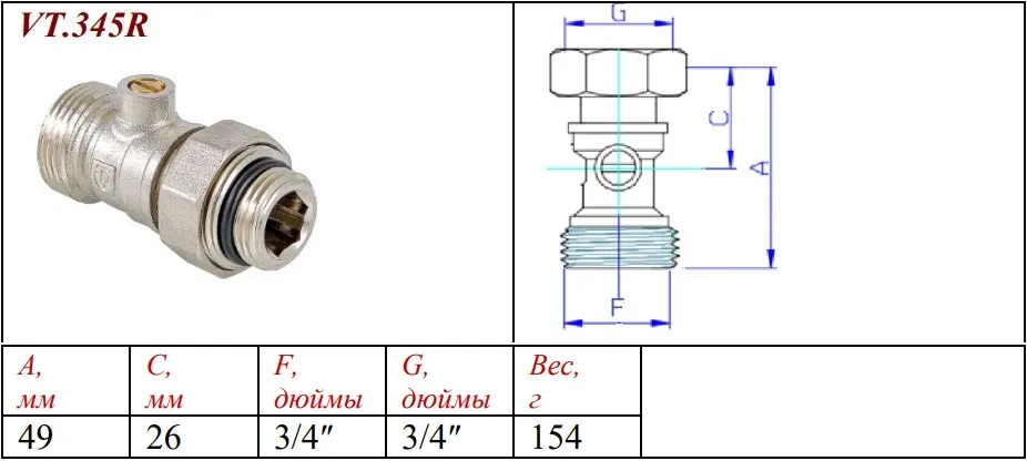 Характеристики товара Вентиль для нижнего подключения запорный прямой ¾"ек x ¾"ек (½"н) Valtec VT.345R.N.05