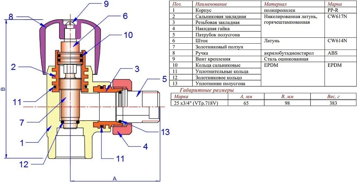 Характеристики товара Вентиль регулирующий угловой 25мм x ¾"н Valtec VTp.718.V.02505