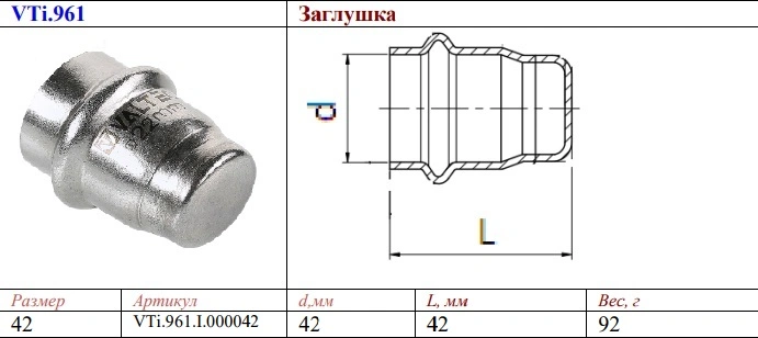 Характеристики товара Заглушка 42мм Valtec VT.INOX-PRESS VTi.961.I.000042