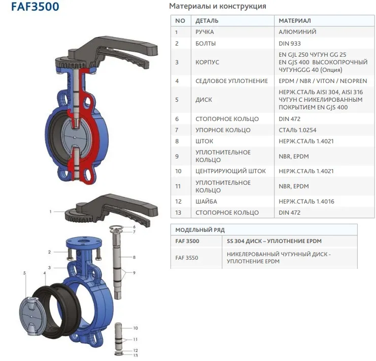 Характеристики товара Затвор дисковый поворотный межфланцевый Ду200 Ру16 FAF Valve 3500200